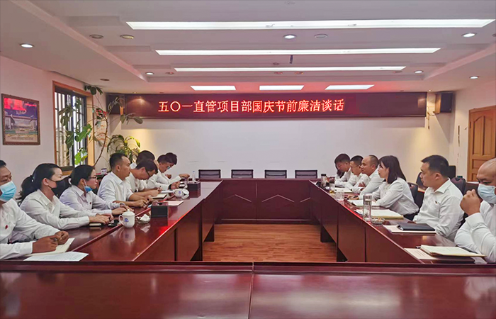 • 9月30日,五〇一直管項目部開展國慶節(jié)前廉潔談話,會議由直管部班子成員、科室負責(zé)人及項目經(jīng)理參會。