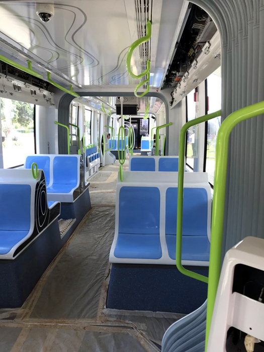 據(jù)悉,蒙自有軌電車內(nèi)部裝飾取材于紅河州哈尼梯田,其中車廂頂部及座位側(cè)邊的裝飾取材于哈尼梯田靈動(dòng)的線條,現(xiàn)代中突顯著紅河州濃郁的地域特點(diǎn)。車廂內(nèi)梯田柔美的線條、藍(lán)白相間的座椅,寬大的玻璃窗,再加上車窗外美麗的風(fēng)景,使有軌電車的每一扇窗口都成了一幅流動(dòng)的風(fēng)景畫。