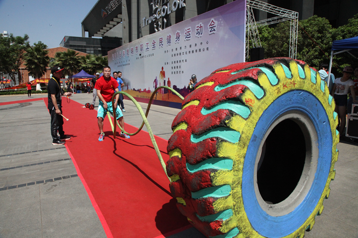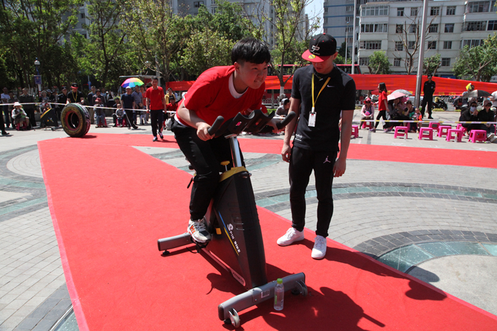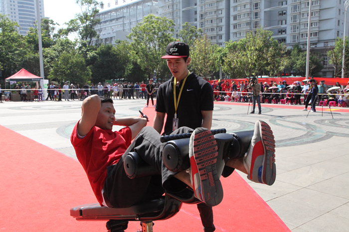 “加油!加油!”伴隨著一陣陣歡呼雀躍聲,昆明市工人文化宮廣場上正在激烈地進行一場全民健身運動會,在場的運動員們整裝待發(fā),他們或3人一組配合沖關(guān)或1人一組“獨創(chuàng)龍?zhí)丁保门幸宦暳钕卤汩_啟酷跑大沖關(guān)的模式。